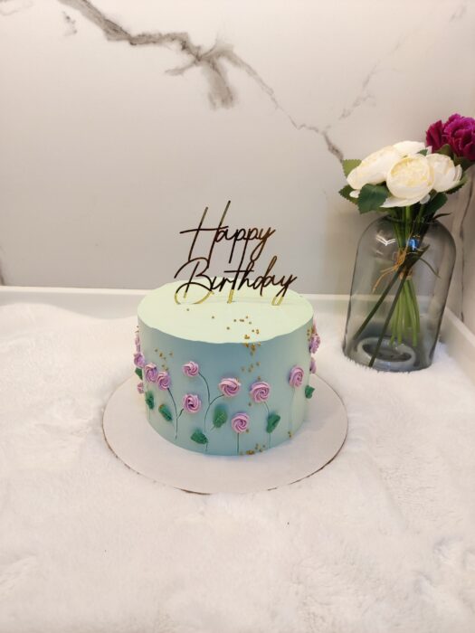 This red velvet cake is so delicious! It’s moist and fluffy, and it’s decorated with a white cream cheese frosting and purple flowers. The cake is topped with a gold “Happy Birthday” topper, making it perfect for any birthday celebration.
