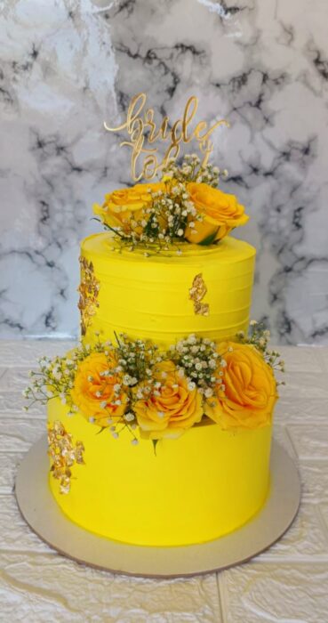 This is Vanilla cake. Two tier haldi cake. Fresh flowers decoration
