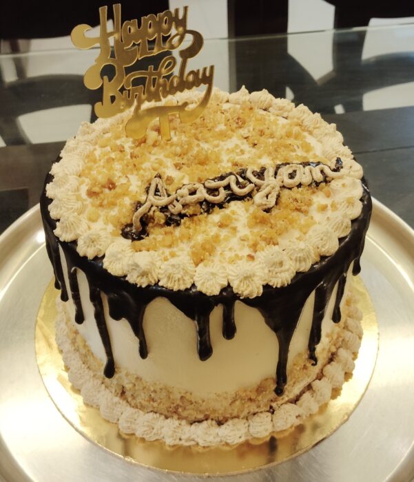 This is a signature cake with an eggless chocolate sponge infused with vanilla and coffee flavours. There are 3 layers with a whipped Mocha Praline cream filling in between topped with chocolate ganache ahd chopped crunchy praline. It brings out the best of chocolate and coffee flavours in every bite.. a sure hit with chocolate and coffee lovers