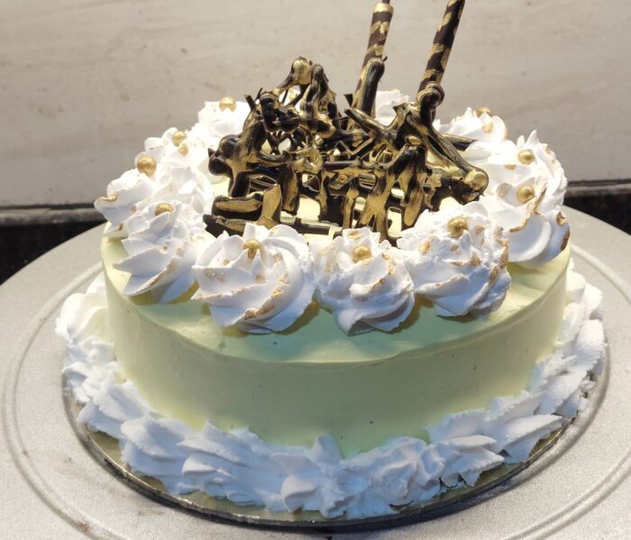 A three layers chocolate sponge with a hint of vanilla. Decorated with chocolate cigars and chocolate shavings. Cake Color customisable
