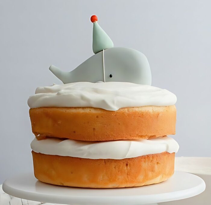 This delightful two-layer cake features a smooth, minimalist design topped with a cute whale decoration, perfect for a child’s birthday or any fun celebration. With its simple frosting and charming topper, this cake is a whimsical addition to any party. 🍰