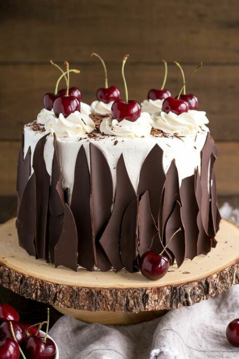 Rich chocolate cake with sweet-tart cherries and whipped cream