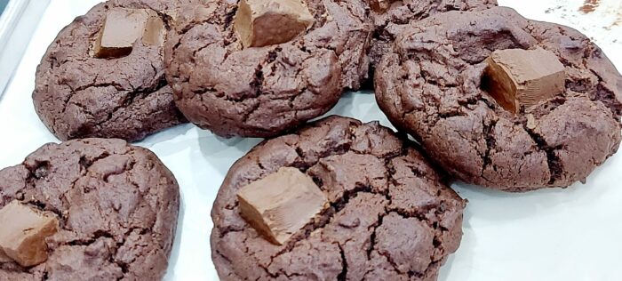 Thick and jumbo double chocolate chocochip cookies with rich cocoa and chocolate chunks. Normal size can also be made.